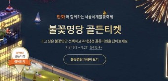 매년 10월이면 여의도에서 하는 대규모 축제가 있습니다. 그것은 바로 여의도 불꽃축제 인데요, 한화라는 대기업이 주도하는 만큼 매년 규모도 커지고 있습니다. 매번 사람이 너무많아 발디딜틈이 없었는데, 이번에는 골든티켓 이벤트도 한다고 하니, 예매하셔서 명당 차지하시길 바랍니다.